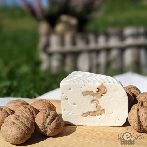 er podpuszczkowy kozi z dodatkiem orzechów włoskich – idealny do sałatek, grzanek lub jako pyszna przekąska. Wyprodukowany z mleka od bardzo szczęśliwych kóz z gospodarstwa ekologicznego “Eko na Szerokim” państwa Małgorzaty i Wiesława Kalickich z Żelkowa pod Siedlcami. Kozy od wiosny do jesieni wypasają się ze swoimi maluchami na zielonych łąkach, a zimą mieszkają w przytulnej oborze pełnej pysznego siana. Dzięki temu ich mleko ma niepowtarzalny smak, a z niego powstają wyborne sery – bez jakichkolwiek sztucznych dodatków.