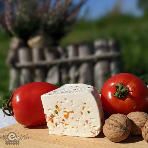 Śródziemnomorski smak prosto z mazowieckiej wsi. Wyborny ser podpuszczkowy, wyprodukowany z mleka od bardzo szczęśliwych kóz z gospodarstwa ekologicznego “Eko na Szerokim” państwa Małgorzaty i Wiesława Kalickich z Żelkowa pod Siedlcami. Tym razem lekko słonawy smak koziego sera, idealnie uzupełniają suszone pomidory. Z dobrym pieczywem, świeżym masłem i naturalnymi pomidorami, będzie stanowił idealne śniadanie bądź przekąskę pod lampkę czerwonego wina. Świetnie nadaje się również na pizze lub zapiekanki. Dzięki wypracowanej przez lata recepturze, kozi aromat nie jest zbyt intensywny, przez co lubią go również dzieci i młodzież.